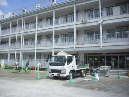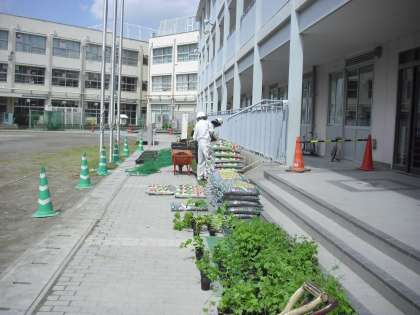 運動会が終わった振替休業日(5月25日)に「みどりのカーテン」を設置しました。より安全に作業をするために、あそび場開放前の午前中に行われました。今年度は、ゴーヤを中心にヘチマ、キュウリが植えられています。職員室前と多目的室前の2か所に設置されていますので、成長の様子を楽しみにしてください。