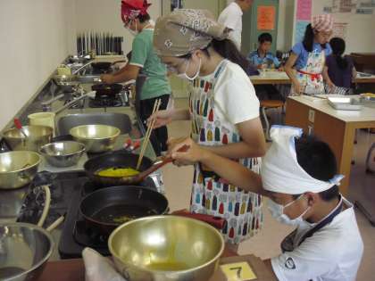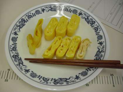 5日(金)に6年生が卵料理の実習を行いました。題して「一人一皿きれいな焼き色の卵焼きを作ろう」です。身支度を整えてから卵を割り、よくかき混ぜてから、慎重に焼き始めました。出来上がりはご覧の通り。自分の作った料理に大満足の様子でした。