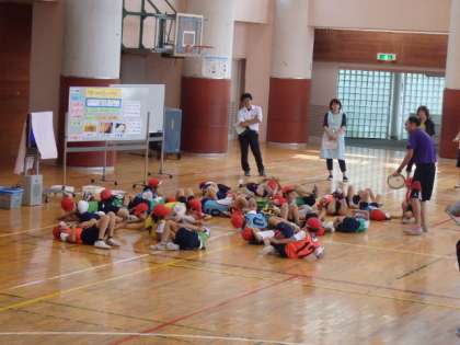 今年度の校内研究は、昨年度に続き体育科で進めています。研究主題は「運動に親しみ、意欲的に実践する力を身に付ける体育学習」〜自己肯定感が高まる助言、評価を通して〜です。今日の授業は、表現運動「全身でなりきりクッキングタイム」友達のよい動きを見付けて全身で大げさに動こうでした。子どもたちは、先生の一生懸命な働きかけにどの子も笑顔があふれ、パンケーキになったりパンになったり、とても楽しそうに授業をしていました。講師は、今年度も日本体育大学教授 白旗和也先生に1年間お世話になります。