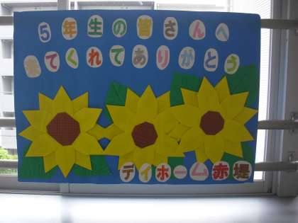 5年生は毎年、「デイホーム赤堤」をクラスごとに訪問しています。7月2日(木)に3組、3日(金)に2組、7日(火)に1組が訪問しました。ホールで高齢者の皆さんとクイズを出したり、子どもたち手作りのすごろくゲームをしたりして楽しいひと時を過ごしました。「子どもたちに会うと元気になります。」「来てくれてとても嬉しいです。」と感想をいただきました。帰りにデイホームの皆さんから子どもたちにすてきなプレゼントをいただきました。5年生の廊下に飾っています。