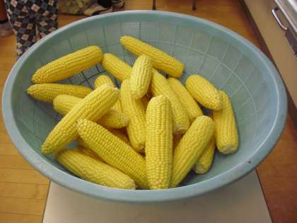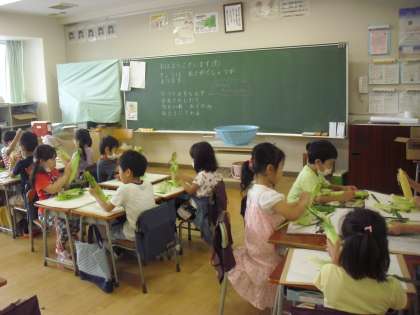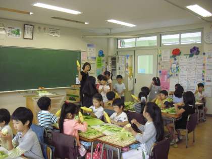 トウモロコシの皮むきは各自机の上で行いました。手洗いをしてからのぞみ、丁寧に作業をしていました。最後に茎の部分を折るのが大変そうでした。トウモロコシ1本で4人分と計算し、わずかな時間で150本もの皮むきをしました。給食時の放送で1年生の活躍が報告されました。