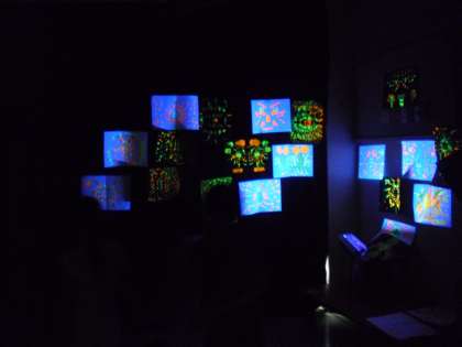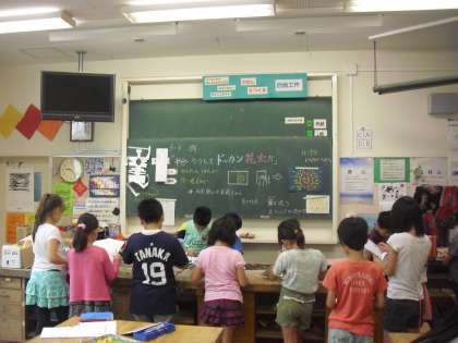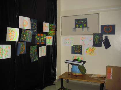9日(木)、3年3組の子どもたちが図工の時間に「ドッカン花火」をつくりました。蛍光塗料を使っての作品です。図工室で花火を中心とした絵を描き、それを遮光シートで覆われている生活科室に持って行きました。生活科室にはブラックライトが設置されているので、絵が光って見えます。子どもたちは「きれい」と歓声をあげ、大喜びでした。