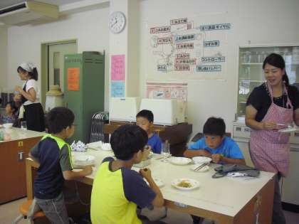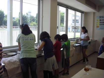 21日(火)より本校のサマースクールが始まりました。初日は、3つの講座がありました。その一つが「一人で作れる朝ご飯」です。この講座は4回開催されますが、今回は兄弟姉妹で作るメニューでした。「ホットドッグ、たまごサンド、野菜サラダ、フルーツヨーグルト」です。二人で身支度を整え、楽しそうに調理をしていました。洗いものも二人で並んで行っていました。