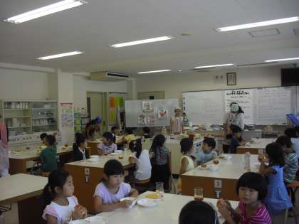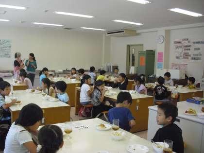 「一人で作れる朝ご飯」講座の2日目は、1・2年生が対象です。ハムサンド、ツナサンド、ミニトマト、フルーツヨーグルトを作りました。予想以上に子どもたちの手際がよく、予定した時刻より早めに試食となりました。自分で作っただけに「おいしい。」ととても満足そうでした。