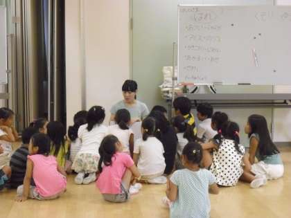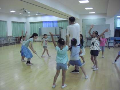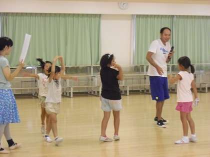 サマースクールも8月に入りました。8月は「なりきっておどろう」からスタートです。午後1時30分から多目的室で、1年生から3年生までの低学年を対象に行われました。天気をテーマに、晴れ、雨、雪、風などを体全体を使って表現していました。子どもたちはにこにこしながら取り組んでいました。