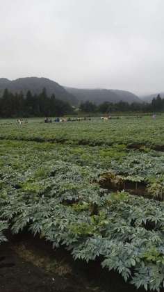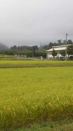 小雨が降る中、こんにゃくや稲の間を村めぐりしています。もう少しでビレジです