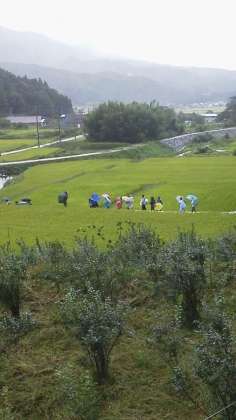 小雨の中、村めぐりに出発です。稲穂がたれ、稲刈り間近の田んぼを見ながら、関りんご園に向かいます。