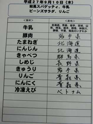 9月10日(木)の給食食材産地について