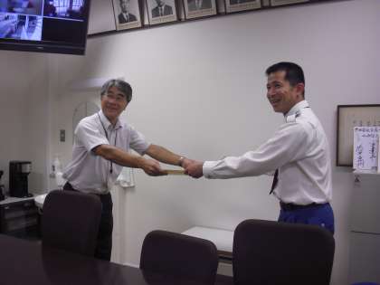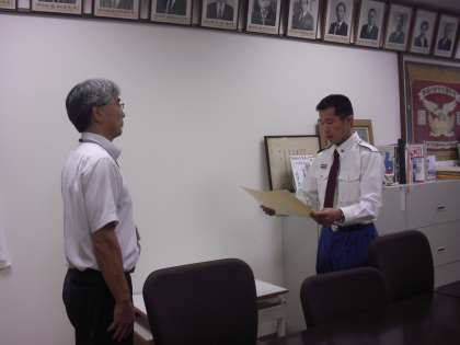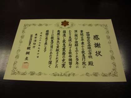 10日(木)午前11時、校長室において世田谷消防署より「感謝状」が贈られました。本校は、毎年の教職員の救命救急訓練はもちろんのこと、総合防災訓練において高学年の子どもたちが救命入門編に参加していることに対し、その取り組みを評価していただきました。全校を代表して校長先生が感謝状を受け取りました。