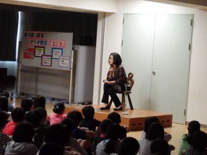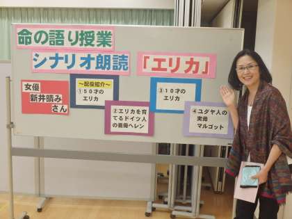 NHK朝の連続テレビ小説「風見鶏」のヒロイン新井晴みさんが「エリカ」のシナリオ朗読をしてくださいました。「エリカ」のメッセージは子供たち一人ひとりに向けた「生まれてくれて、ありがとう」です。朗読では、50才のエリカ、ドイツ人の養母ヘレン、10才のエリカ、ユダヤ人の実母マルゴットの四役を演じられました。「エリカ」という物語に感動するだけでなく、女優の演技力の素晴らしさも実感いたしました。