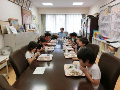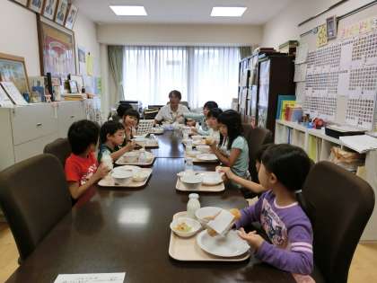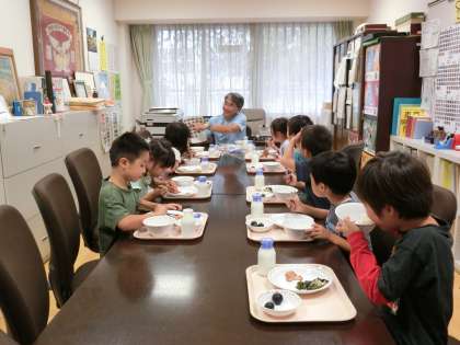 1年4組の子どもたちは、9月24日(木)、28日(月)、10月2日(金)の3回に分けて校長先生と給食をとりました。子どもたちは牛乳びんを持って校長先生が教室まで迎えに来るのを待ちます。自分の分を自分で配膳し、大きな声で「いただきます。」とあいさつができました。2日でクラスごとの会食は終わりました。6日からはたてわり班ごとに会食となります。