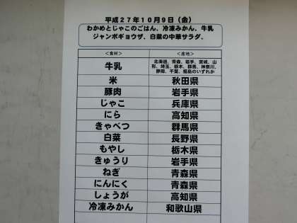10月9日(金)の給食食材産地について