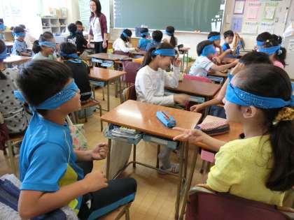 9日(金)4年生が総合的な学習の時間に「アイマスク体験」をしました。講師は世田谷ボランティア協会の方です。1時間目に2組、2時間目に1組が学習をしました。視覚障害とはどういうものなのか、「見えない」ことを理解したり、見えなくてもできることがあることを知ったり、自分たちにできることを考えたりしました。子どもたちはバンダナをアイマスクとして、すわったまま学習しました。自分の筆箱からえん筆を出したり、クレヨンから特定の色を出したり、となりの子とジャンケンをしたりしながら、言葉かけやコミュニケーションの大切さを感じていました。