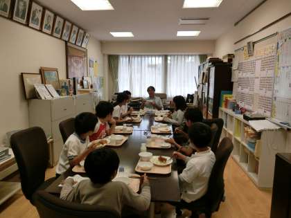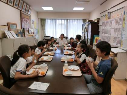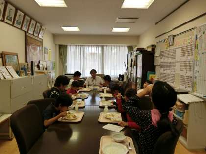 校長室での給食会食はたてわりの2班でした。9日(金)、14日(水)、15日(木)に行われました。食事をしながら改めて自己紹介をしていました。低学年の子の紹介を笑顔で聞く高学年の姿があり、おたがいをより知ることができたようです。