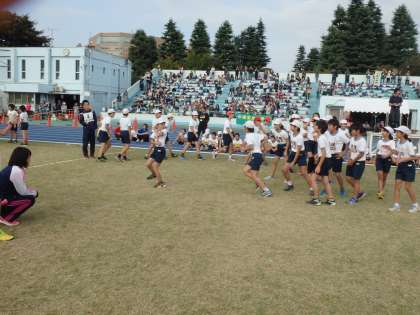 連合運動会の最後の種目は、5分間長なわ跳びでした。どの学級も自己ベストは出ませんでした。大会記録は、平成24年度の用賀小Bの793回です。閉会式では、各種目記録の上位3名の発表がありました。本校は、男子100m走1位13秒3、男子走り高跳び1位130cm、女子50mハードル走D2位9秒4が呼ばれました。