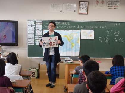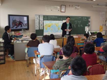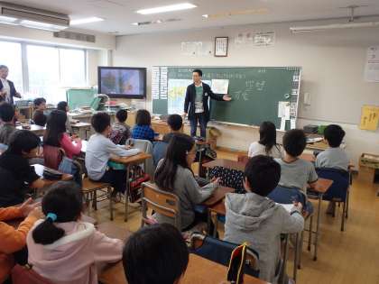 5年3組の中国留学生は、浙江省出身の方で、日本と同じように四季がはっきりしている所だそうです。「你好」「可愛」「英俊」の中国語を教えてくださいました。また、「年獣」(ライオンの頭、牛の体、角を持っている怪獣)、オリンピック選手(馬琳【卓球】、孫楊【水泳】)などの話もしてくださいました。