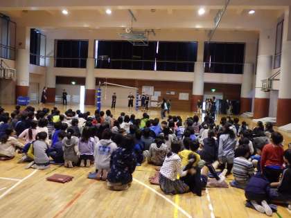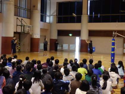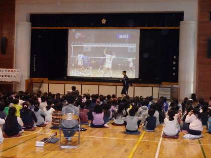 今日は、バレーボール元日本代表のFC東京 伊東克明選手をお招きして、バレーボール教室が行われました。2校時は、4・5・6年生に向けて、スポーツを通じて得られるもの〜スポーツ(バレーボール)の楽しさについて〜をお話いただきました。その後、早稲田大学3年の女子バレーボール部員2名が、伊東選手といっしょにオーバーハンドパス、アンダーハンドパス、スパイク、サーブを見せてくださいました。最後には、児童の希望者がサーブレシーブをしてみました。