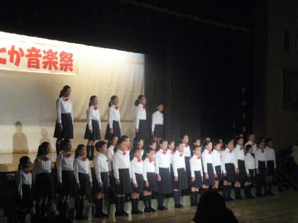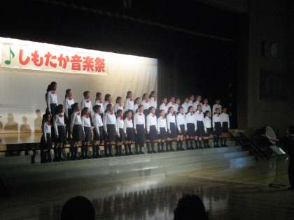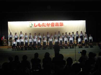 学校公開期間が終わった午後、松沢小学校のアリーナを会場にして行われている「しもたか音楽祭」に合唱団が参加しました。「さびしいかしの木」「星の世界」「村祭り」の3曲を披露しました。同じ赤松学舎として、松沢小の金管バンド、松沢中の吹奏楽部も参加しました。