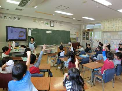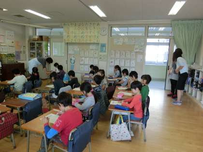 1年生がクラスごとに「食物アレルギー」についての学習をしました。講師は、本校の養護教諭です。人によって、アレルギーがあるために特定の食べ物が食べられないことがあり、それは好ききらいで残しているのとは違うことを学びました。最後のクイズは、全員が正解しました。写真は1年2組の様子です。