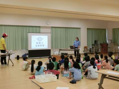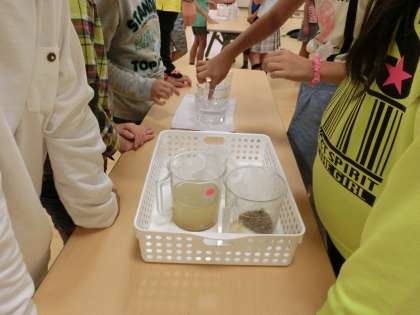 4年生は社会科で「水が届くまで」を学習しています。今回は、使った水がどのように処理されているのかを「下水道キャラバン」のみなさんに来校いただき、いっしょに学習しました。映像を見たり、自分たちで実験をしたりしながら、下水道の働きを学びました。