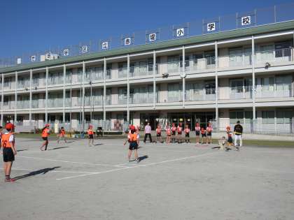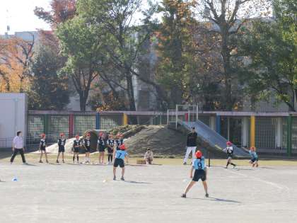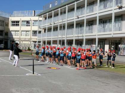 9日(水)、ジャイアンツアカデミーから2名のコーチにお越しいただき2回目の「野球教室」が行われました。前回は雨のため体育館での学習となりましたが、今回は晴天の下、子どもたちの元気な声が校庭中に響きわたりました。ボールを打ち、決められた場所にバットを置くだけで1点がもらえ、全員が得点できるのも魅力でした。写真は、4年1組の様子です。