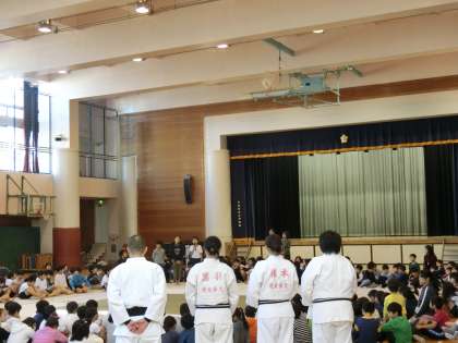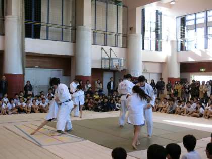 男子に続いて女子の代表も挑戦しました。最後は、柔道経験のある先生が登場し、塚田さんの胸を借りました。塚田さんの得意とする「大外がり」をかけられたり、かけたりして大いに盛り上がりました。第2部の最後は、実行委員からお礼の言葉を述べ、2時間の授業が終わりました。