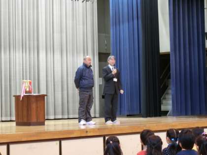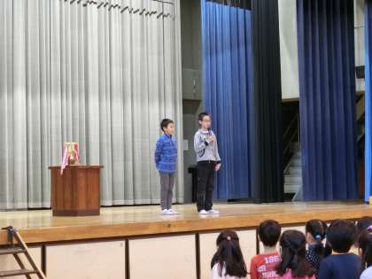 1月8日(金)、体育館で3学期の始業式が行われました。校長先生のお話は3点ありました。「今年の干支は申年」「学校は勉強するところ、そして集団生活の仕方を学ぶところ」「先生、家族、地域の方々に感謝の気持ちをもつこと」です。次に、新しくいらした主事さんの紹介をしました。児童代表の言葉は4年生です。「あまり遊ばなかった友達ともすすんで遊びたい。」「高学年になる準備をする。」「苦手なことにも挑戦したい。」「外で元気に遊ぶ。」など自分の決意をしっかり述べることができました。
