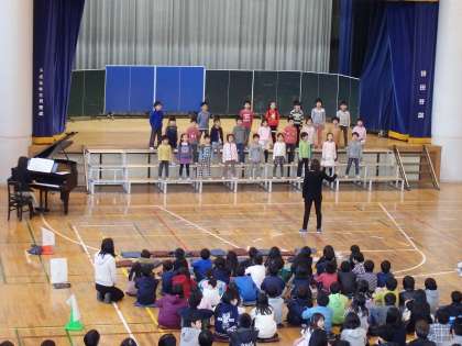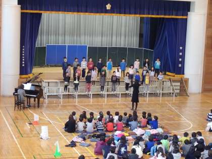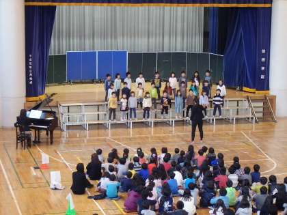 第4プログラムは、4校時に3組グループの発表でした。4年が二学級のため、1年4組が入っています。1年3組は「友だちになるために」「にじ」、1年4組は「大きな歌」「にじ」、2年3組は「夕やけこやけ」「手のひらを太陽に」でした。1年生にとっては、初めての学級音楽発表会です。さぞ緊張したことでしょう。でも、しっかり歌えてました。
