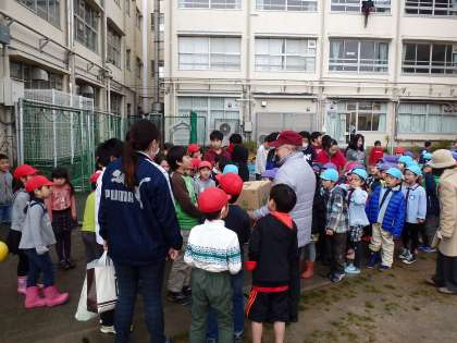 今年度閉園を迎えるファチマのマリア幼稚園から、うさぎの「ゆき」ちゃんを譲り受けました。本校の中休みにあわせて、年長さん全員が「ゆき」ちゃんを連れてきてくれました。本校は、飼育委員が児童を代表して、受け取りました。これから、大事に育てていきます。