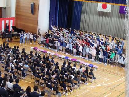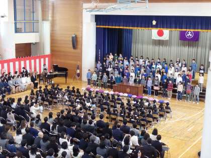 春らしい天気、咲き誇る桜に迎えられて、平成28年度入学式が行われました。残念ながら、2名の欠席がありましたが、今年の新入生は95名です。式は、新しい赤堤小のリーダーとなった6年生の素晴らしい歌声の中、新入生が入場しました。「ありがとうございます」がしっかり言える新入生。2年生も歓迎の言葉(呼びかけ、歌、合奏、寸劇)をしっかり行いました。1年間の成長が著しかったです。明日から、6年生がしっかり1年生の世話をしてくれます。1年生も、「早起き早寢」「好ききらいなく食べる」「1日1時間以上外遊びをする」の三つのお願いをがんばりましょう。