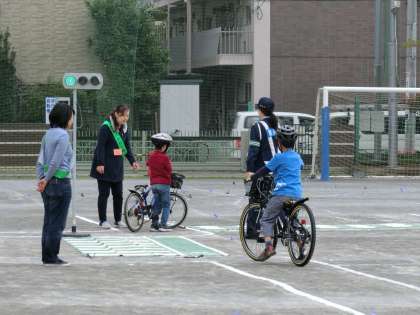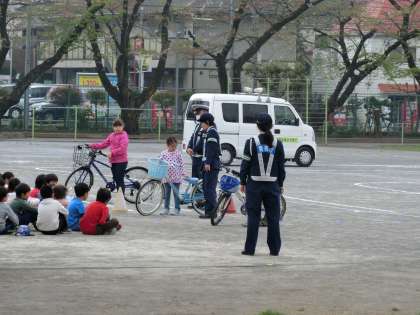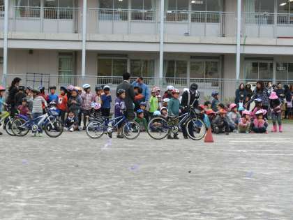 13日(水)の3時間目、3年生を対象にした自転車の乗り方についての「交通安全教室」が校庭で行われました。ヘルメットをかぶって、一人ずつ校庭に用意されたコースを走りました。ここでも保護者の方が要所要所について一人一人に、「ここで止まってね。」「右左だけではなく、右ななめ後ろも見るよ。」と声をかけてくださっていました。春の全国交通安全運動は15日(金)で終わりますが、子どもたちには事故を起こしたり、巻きこまれたりせず、これからも安全を守る意識をもち続けてほしいと思います。