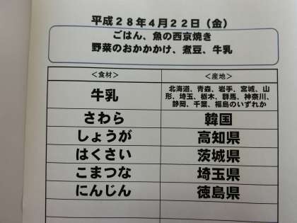 4月22日(金)の給食食材産地について