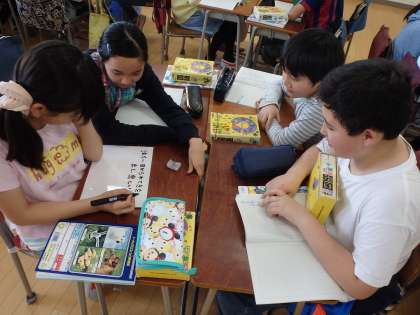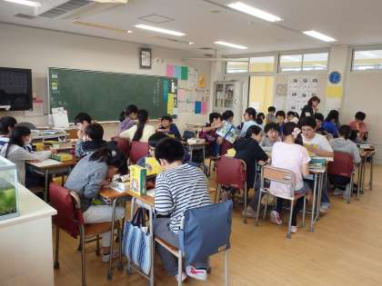 今日の授業は「国語辞典から広がる言葉の世界」でした。先生はまず、「頭が辞典と考えて言葉を説明してみよう」という課題(北、トマト、右、美しい、カニ、泣く、正座、パンダ)を与えました。子どもたちは、興味深く話し合い授業に入り込んでいました。子どもたちは、班ごとに考え発表した後、国語辞典でどう書いてあるか確かめました。簡単な言葉ほど、説明しようとすると難しいことが分かったと思います。