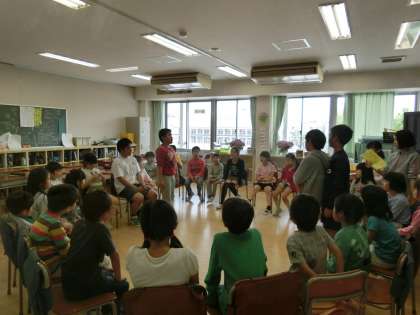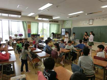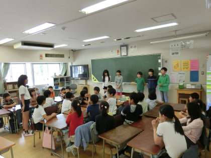 4月25日(月)は、掃除と昼休みの時間をなしにして、その代わり「ロング昼休み」と題した「たてわり活動」が行われました。本校のたてわり班は、1年生から6年生まで約30人で1つの班(1班から18班まで)を作り、さらに10人ずつに細分化してA班、B班、C班に分かれています。第1回目の25日は、各班の教室に集まり6年生が司会進行をする中、自己紹介や仲良くなるためのゲームを行ないました。6年生はずっと立ったままでしたが、班内をまとめようと頑張っていました。