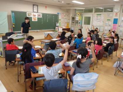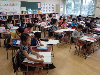 今日の授業は「作文を書こう」でした。子どもたちは、6日に行った井の頭公園遠足を題材に作文を書きます。ただ遠足に行けなかった子も2名いましたので、その子には「楽しかった連休」「初めてのランドセル」など書きたいことを考えさせていました。遠足に行った子には、はじめに遠足の写真を紹介しました。子どもたちは、写真を見ているうちに、楽しかったことを思い出し、何を書こうか題が浮かんできたようでした。どんな作文になるか楽しみです。