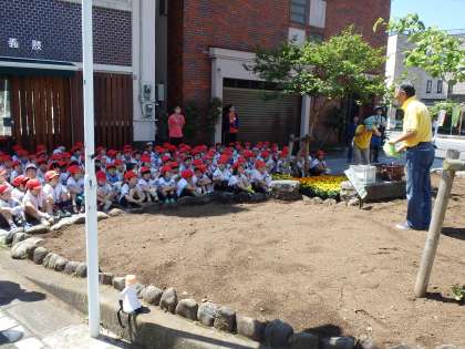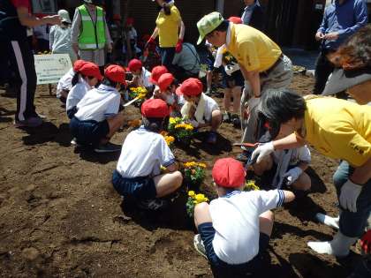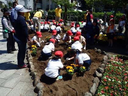 赤堤3丁目自治会会長さんのお話の後、赤堤3丁目自治会の皆さんと一諸にマリーゴールドとベゴニアを植えました。一人欠席でしたので、108名がお世話になりましたが、どの子もとても静かに話を聞くことができました。六所神社近くの世田谷線踏切の花壇です。子どもの案内で見に行っていただければ、子どもたちも喜ぶと思います。