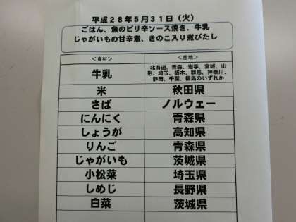 5月31日(火)の給食食材産地について