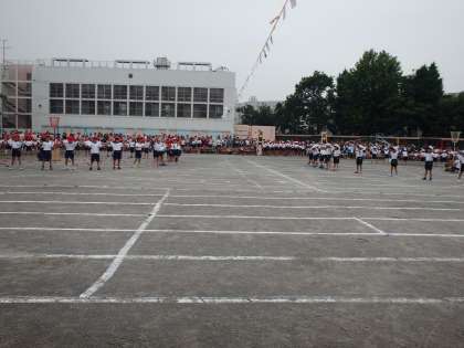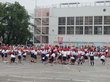 1年生のかわいい振りに、思わず応援団もいっしょに踊っていました。6月に実施される体力テストでも、記録が伸びない投力ですが、1年生も玉がなかなか入りません。日常の投運動経験のなさが原因です。わくわくスポーツタイムでも力を入れています。