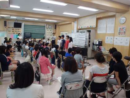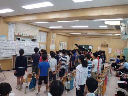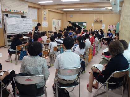 5月に続いて2回目の模範授業です。今日は、区内外より24名の音楽専科が参観に来ました。幼さが残っている子どもたちに対し、子どもたちの気持ちをくみ取りながら、授業を進めていました。また、常に自分の考えを発表させ、子どもたち一人ひとりの考えの違いを自然に味わう授業でもありました。子どもたちの笑顔と美しい歌声が印象に残る授業でした。