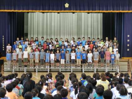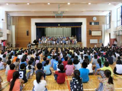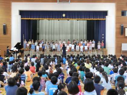 7月8日(木)は体育館で音楽朝会でした。最初に合唱団の子どもたちがNHK合唱コンクールに出るため練習中の曲を披露しました。美しい歌声に会場の子どもたちは聞き入っていました。その後、6年生がひな壇に並び、6月の音楽朝会で披露した「翼をください」の2番を2部合唱で披露しました。6年生の歌声もとても素晴らしかったです。6月7月と2回に分けて「翼をください」を練習してきたので、子どもたちは1番も2番も上手に歌えるようになりました。
