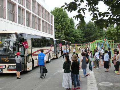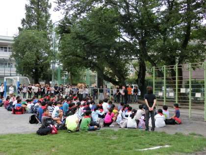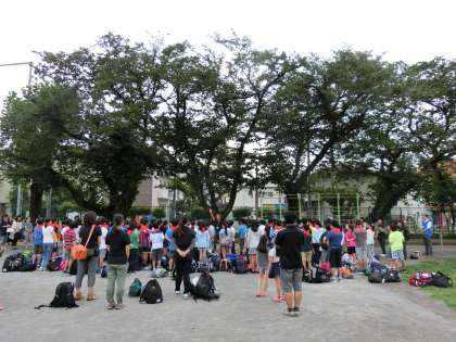7月25日(月)、6年生が日光林間学園に向けて午前7時45分に集合しました。校庭で出発式を行いました。引率の教員は黒色のポロシャツを着ています。8時5分、たくさんの保護者や先生たちに見送られ、日光に向けて出発しました。