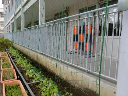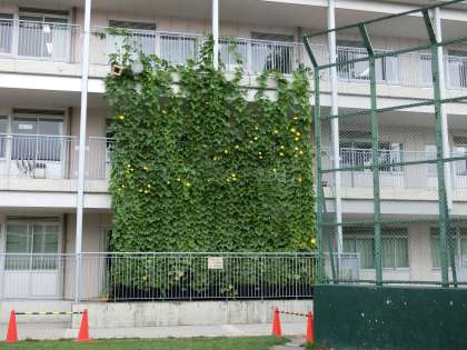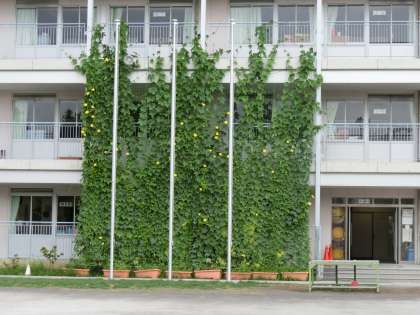 7月25日(月)現在のグリーンカーテンの様子です。5月30日に苗を植えてから(写真の1枚目)約2ヶ月でこんなに大きくなりました。