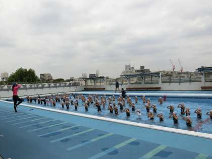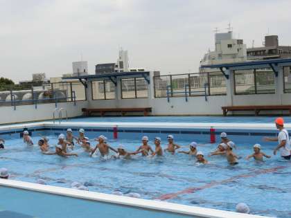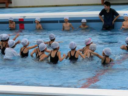 22日(金)が雨だったため、25日(月)から前期の夏季水泳指導が始まりました。高学年、中学年、低学年の順で練習をしていきます。写真は1・2年生の様子です。音楽に合わせて水に潜る練習をしたり、向こう岸まで大股で歩いたりしながら楽しく過ごしていました。