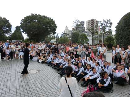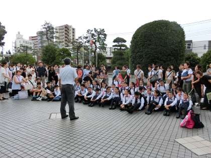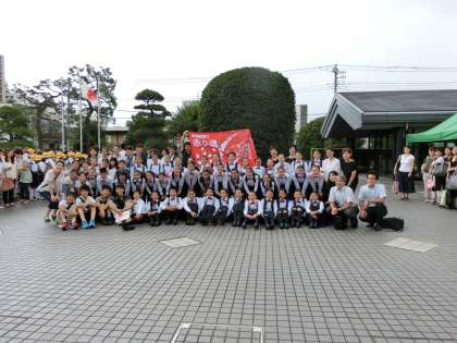 7月31日(日)、NHK全国学校音楽コンクール 東京都コンクール予選が開催されました。本校の合唱団は、午前の部の6番目に出場し、4年生から6年生までの42人が日ごろの練習の成果を披露しました。合唱団の保護者はもちろん、卒団した中学生やその保護者の方もたくさん応援に駆け付けてくださいました。夕方に成績発表があり、本校は金賞を受賞しました。8月10日の本選に出場します。写真は、午前の部終了後に会場の外で撮ったものです。