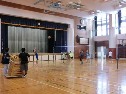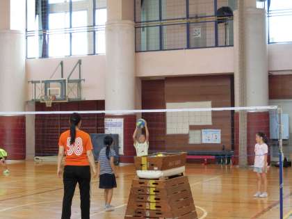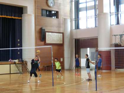 サマースクールのバレーボール教室が1日(月)で最終回を迎えました。最後は、試合形式での練習です。サーブは先生が入れ、それをキャッチしてから、仲間にボールをアンダーで上げてトス、アタックとつなぐようにしました。タイミングの取り方が難しく、苦戦していましたが、それでもつながったときは「やったー」と喜ぶ姿がありました。
