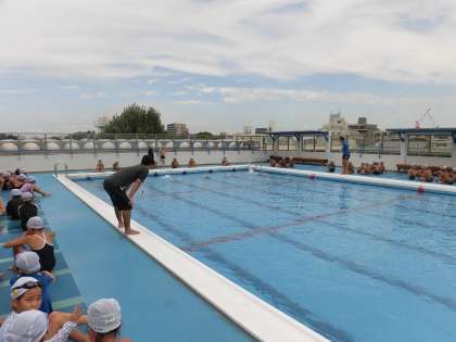 8月22日(月)から後期の水泳指導が始まる予定でしたが、台風の影響で中止になりました。翌23日(火)は、高学年の部、中学年の部ともに実施できましたが、低学年の部だけは雨が降り出したために中止になりました。