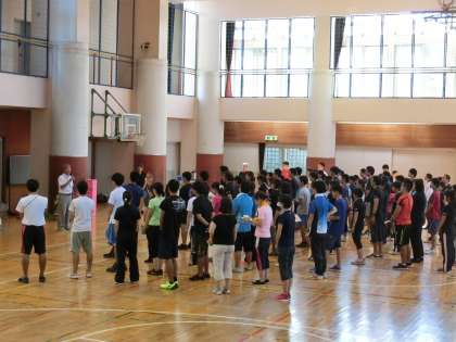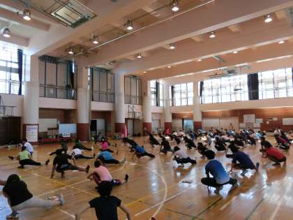 8月26日(金)の午後、本校の体育館に8つの小学校の先生達が集まりました。体育の授業に役立つ研修を行いました。前半は体育館で体をほぐし、後半は校庭でタグラグビーか体育館でボール運動かを選んで研修しました。暑い中でしたが、先生達の親睦を深めながら学ぶことができました。