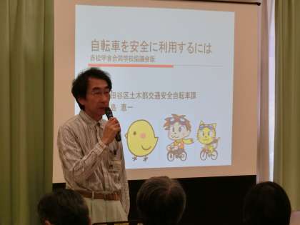8月29日(月)の午後、多目的室において「赤松学舎合同学校協議会」が開催されました。松沢中学校、松沢小学校、赤堤小学校の学校協議会会員の皆さん122名が参加しました。全体会第1部では、世田谷区交通安全自転車課の方を講師に招き、「自転車を安全に利用するには」と題してお話いただきました。その後、3つの分科会に分かれて、自転車の利用の仕方をはじめ、情報交換をしました。写真は、講演の様子、「健全育成」分科会の様子、「防災・防犯」分科会の様子です。