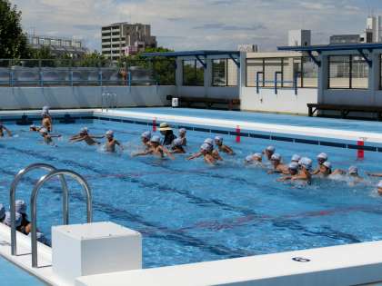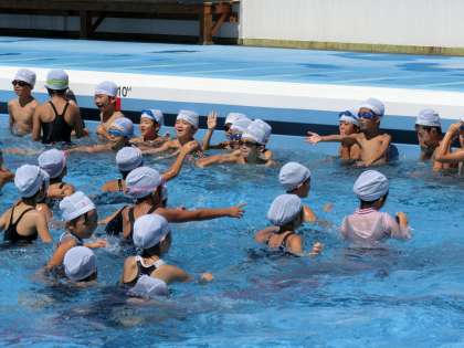 5日(月)の3・4時間目の水泳指導は、2年生でした。水に慣れた後は、検定をしました。写真は、水に慣れる様子です。向こう岸まで大股で歩いている子どもたちです。