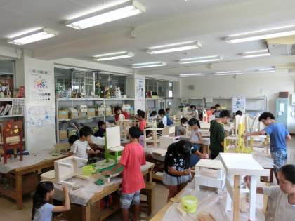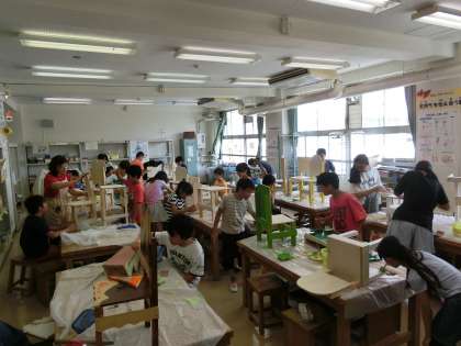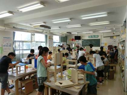 6年生2学期の図画工作は、「12才の力で」と題した「いす作り」の色付けからスタートです。1学期にくぎ打ち、やすりかけまで終わっているので、6日(火)は、色ごとに分かれて、作業を行いました。写真は1組の様子です。色付けは次回も行うそうです。完成がとても楽しみです。